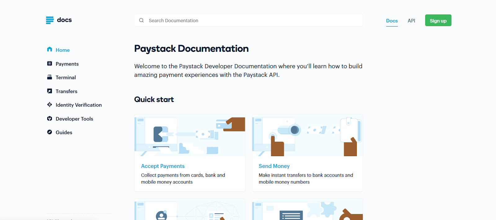 Here’s an example of Paystack’s documentation. It has a well structured interface, and each API endpoint is explained through clear instructions and detailed JSON responses.