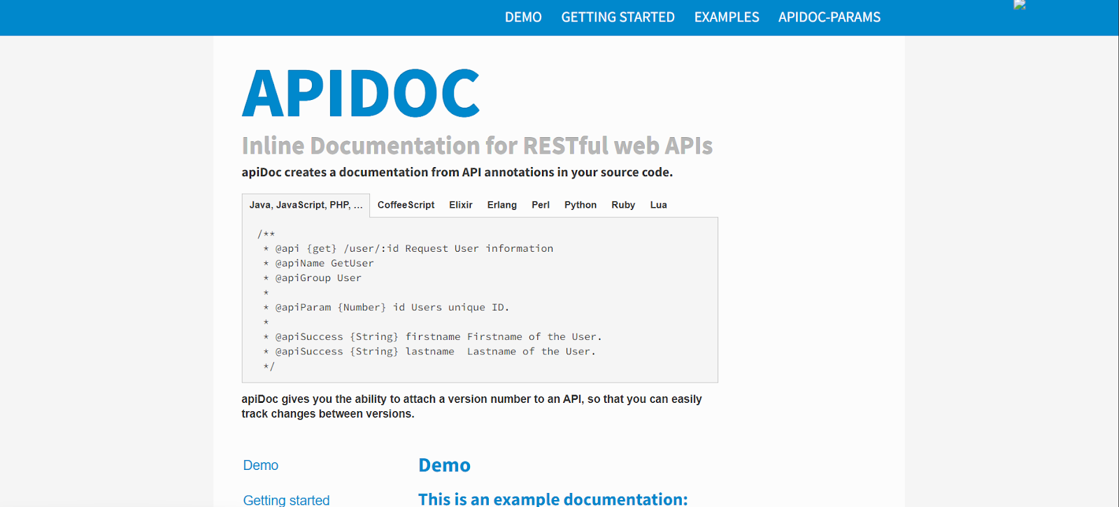 This tool is particularly useful for small teams or solo developers who want an automated solution without introducing too much overhead. apiDoc supports RESTful APIs. Therefore, you can include custom parameters and authentication details.