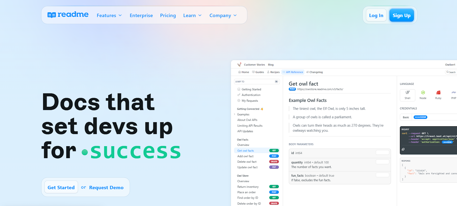 ReadMe is designed with the developer experience in mind. It allows you to create attractive and responsive API documentation sites with minimal effort. Moreover, ReadMe supports dynamic content based on user context, meaning developers can get tailored examples and keys based on their account.
