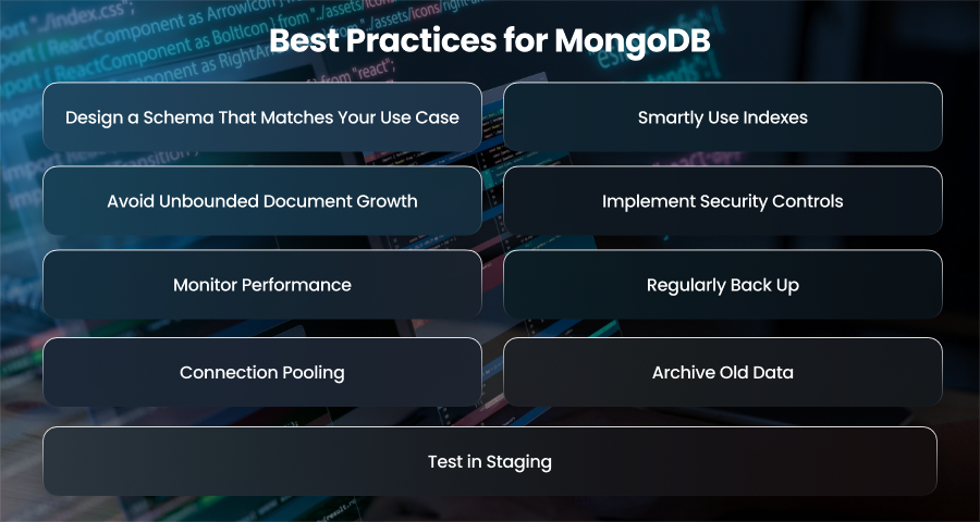 Therefore, fields that are often utilized in search or filtering operations should have indexes created for them. In order to eliminate unnecessary indexes, it’s also critical to routinely assess index utilization using MongoDB’s integrated monitoring tools. Also, compound indexes can be particularly useful when used thoughtfully.