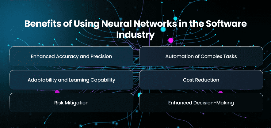 You can integrate neural network models in your software projects to enhance accuracy and precision, make complex tasks easier, and achieve better decision-making. Furthermore, it reduces huge costs and is highly scalable and adaptive.