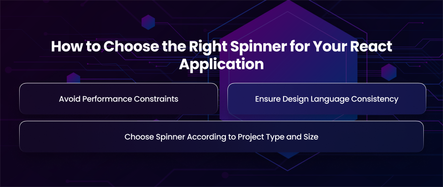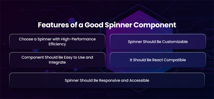 One thing you need to consider is to ensure that your chosen spinner component is React compatible. Moreover, you also need to double-check that the spinner works perfectly with the latest React versions and is compatible with React libraries such as React Router and Redux.