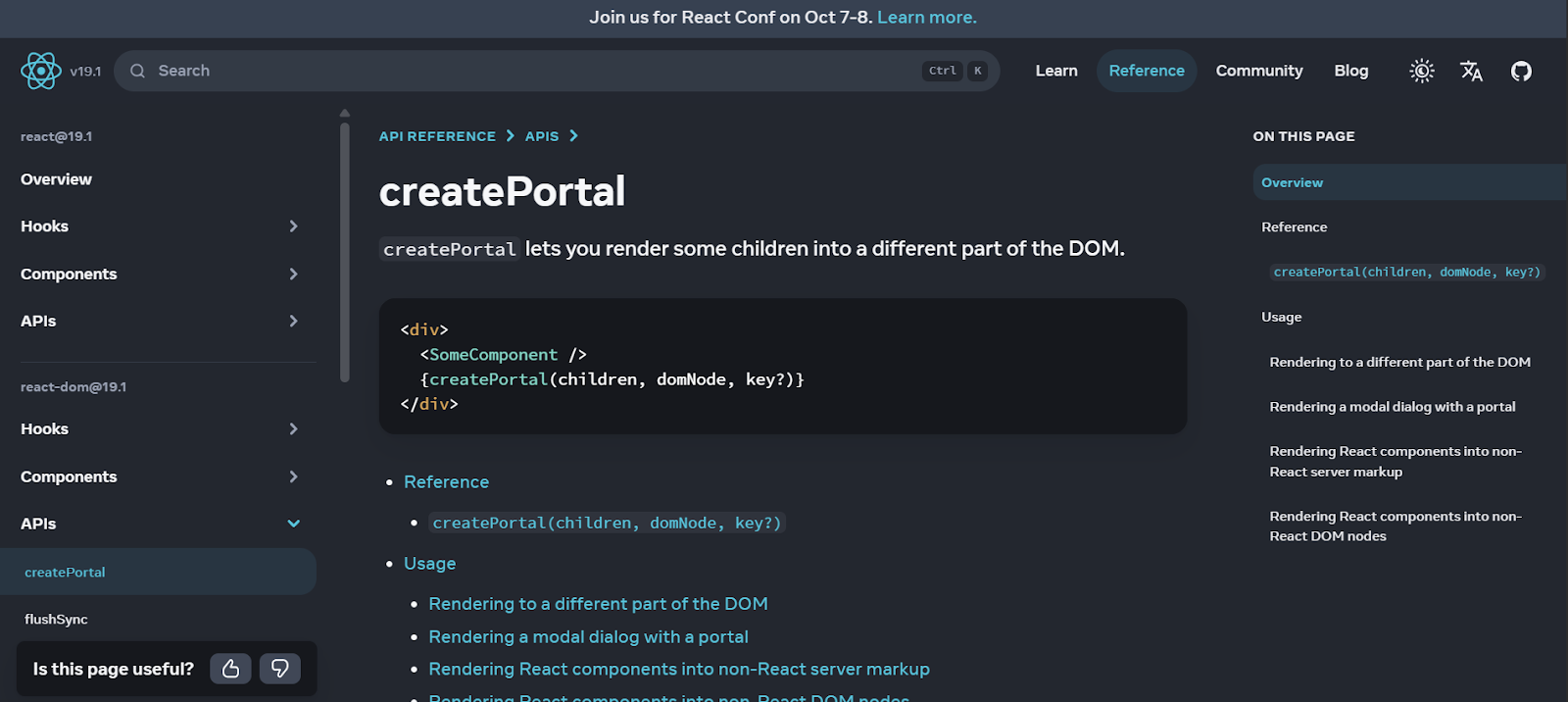 The Portal API uses the function ReactDOM.createPortal(child, container). Moreover, if you have a modal or tooltip that needs to appear on top of everything else. Therefore, using a portal lets you render it into a dedicated DOM node outside of your main application structure.
