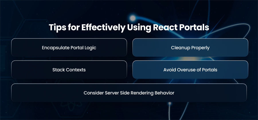 Not every floating UI element needs to be rendered through a portal. Overusing them can clutter your DOM structure and introduce unnecessary complexity. Also, you should use portals when you need to escape layout constraints like overflow: hidden or stacking context issues. Furthermore, you can use the element to overlay or float outside its natural parent. Additionally, you can use portals when you require better positioning or global styling not feasible in the component tree.