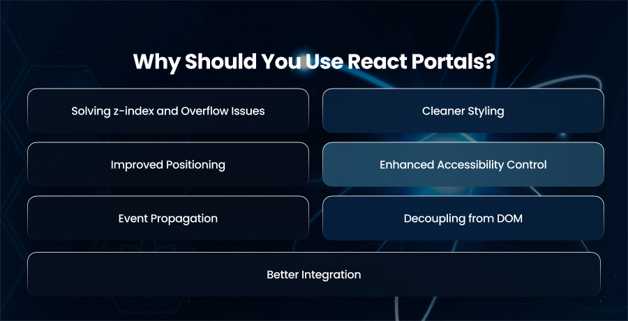 One of the best aspects of React Portals is that they decouple visual placement from logical structure. In other words, you can maintain clean and reusable component logic while rendering most elements in the most visually appropriate place in the DOM. Hence, this separation of concerns improves maintainability, especially in large codebases where layout constraints and visual placement often conflict with component reusability.