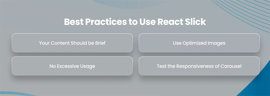 This might seem absurd, but the excessive usage of a carousel can impact the performance. There’s no doubt that carousels are useful, but too many sliders on one page slow down the performance of the application. Hence, it is advised to use the React Slick carousel strategically.
