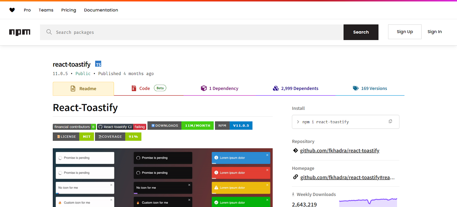 There is ongoing maintenance and usage of React Toastify. You can thus anticipate regular updates and strong community support. If you run into issues, GitHub and other communities also provide solutions. Also, the documentation is also detailed and beginner friendly, hence making it easy to integrate and troubleshoot the library in your application. Also, this vibrant ecosystem of users and contributors helps ensure the tools remains reliable and up to date.